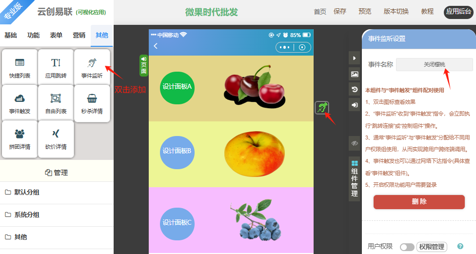 通过"事件监听"与"事件触发"组件完成交互